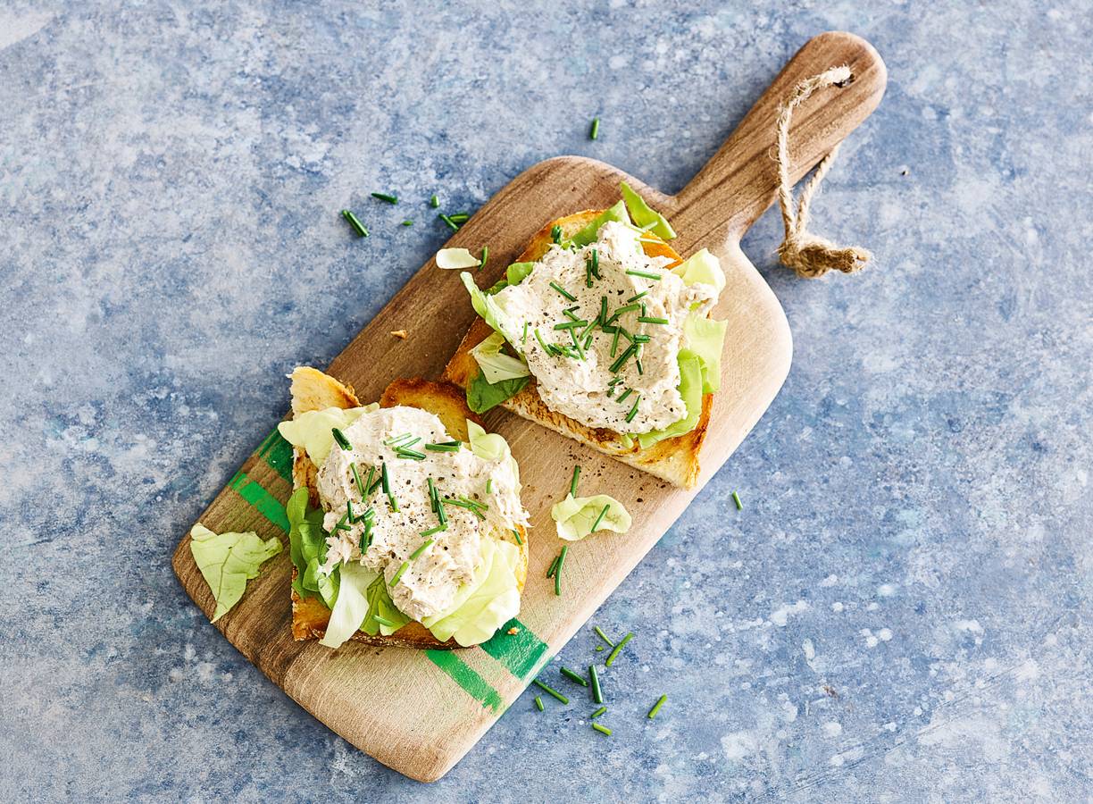 Rasp de gele schil van de citroen en pers de vrucht uit. Laat de makreelfilets uitlekken. Doe 2 tl citroenrasp, 1 el citroensap, de makreelfilets en de zuivelspread in een hoge beker en pureer met de staafmixer tot een grove paté. Verhit de olie in een grote koekenpan en rooster de sneetjes brood in 5 min. goudbruin en knapperig. Keer halverwege. Snijd ondertussen de bieslook grof. Beleg de sneetjes brood rijkelijk met de botersla. Verdeel de makreelpaté erover. Garneer met de bieslook.