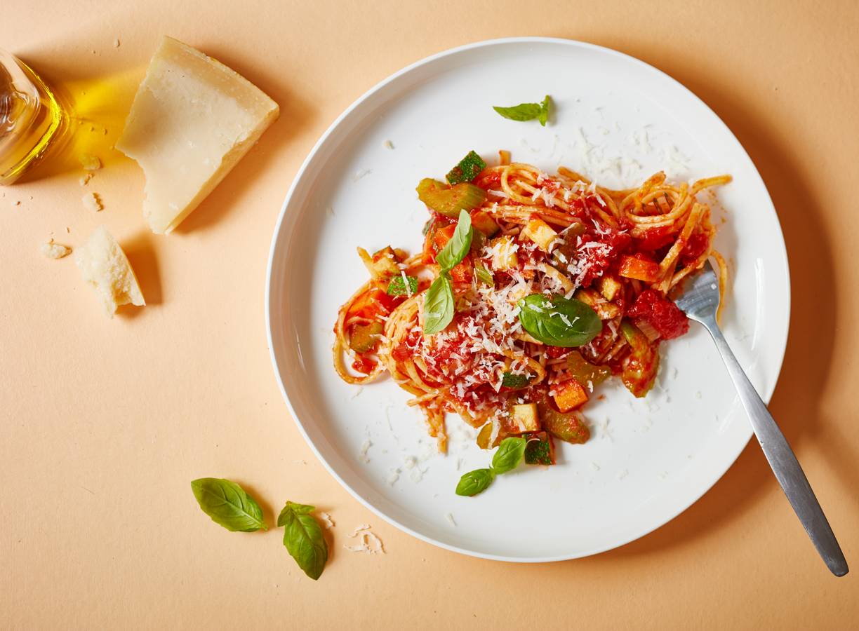 Snijd ondertussen de courgette in blokjes van 1 cm. Voeg de laatste 5 min. toe aan de saus. Breek de tomaten met een pollepel in stukjes. Kook ondertussen de pasta volgens de aanwijzingen op de verpakking. Rasp de Parmezaanse kaas. Verdeel de pasta en saus over de borden en bestrooi met een deel van de Parmezaanse kaas. Serveer de rest van de kaas erbij.