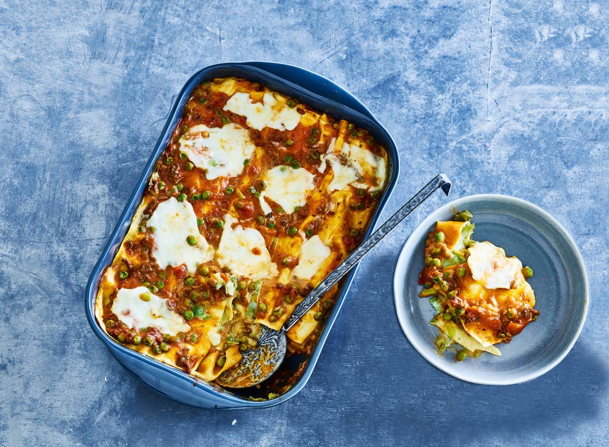 Verwarm de oven voor op 200 °C. Verhit de olie in een hapjespan en bak het gehakt in 5 min. rul. Voeg het water, het vocht uit het zakje mozzarella en de basis voor lasagnesaus toe en breng al roerend aan de kook. Voeg de tuinerwten toe en laat 1 min. zachtjes doorkoken. Verwarm de prei à la crème in een pannetje.
