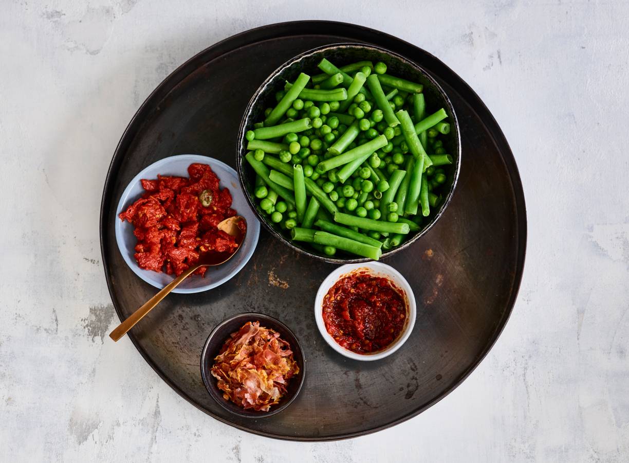 Laat ondertussen de tomaten en kappertjes uitlekken en snijd fijn. Doe de tomaat, pancetta en sambal in aparte schaaltjes en serveer bij de sperziebonen en tuinerwten. Zo kan iedereen zelf zijn groente op smaak brengen.