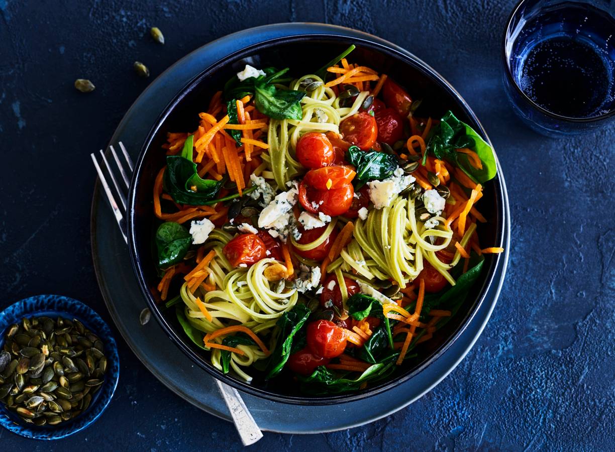 Doe de pompoenspaghetti in een vergiet en giet de tagliolini erover af en meng de spinazie en tomaten erdoor. Verdeel over diepe borden en bestrooi met de pompoenpitten en blauwe kaas.