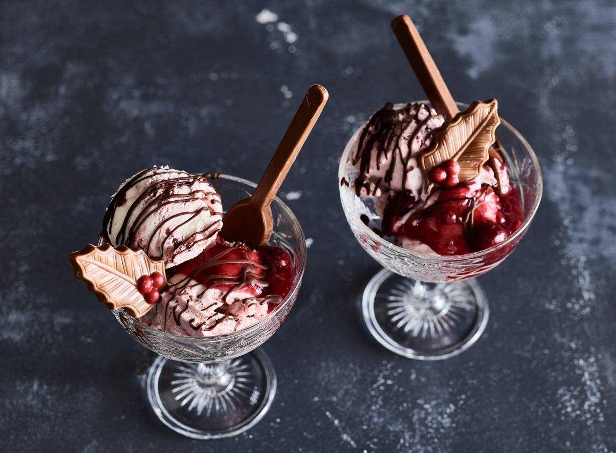 Schep 1 kleine bol ijs in een glas en schenk de kersenfruitvulling erover. Schep er nog 1 kleine bol bovenop en schenk ¼ van de gesmolten chocolade erover. Maak zo nog 3 glazen.