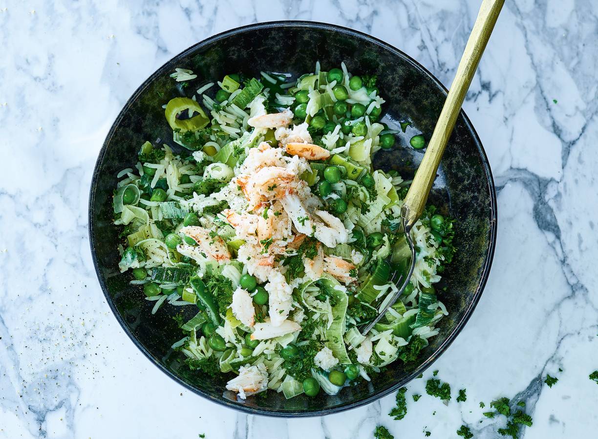 Het groene van de tuinerwten en roze van de krab knalt van je bord.