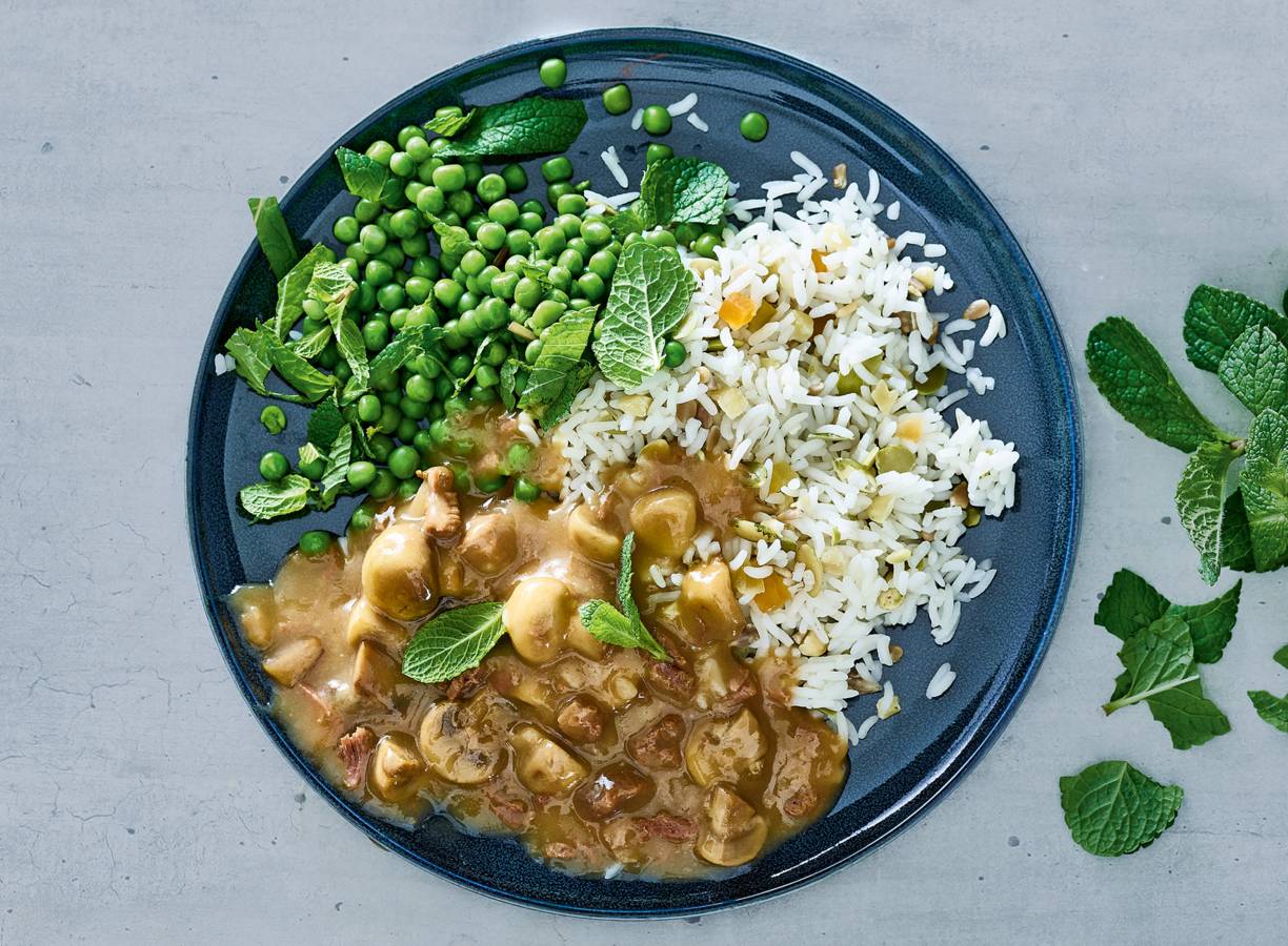 Meng 2/3 van de munt door de erwtjes. Verdeel de rijst, ragout en erwten over de borden. Bestrooi met de rest van de munt.