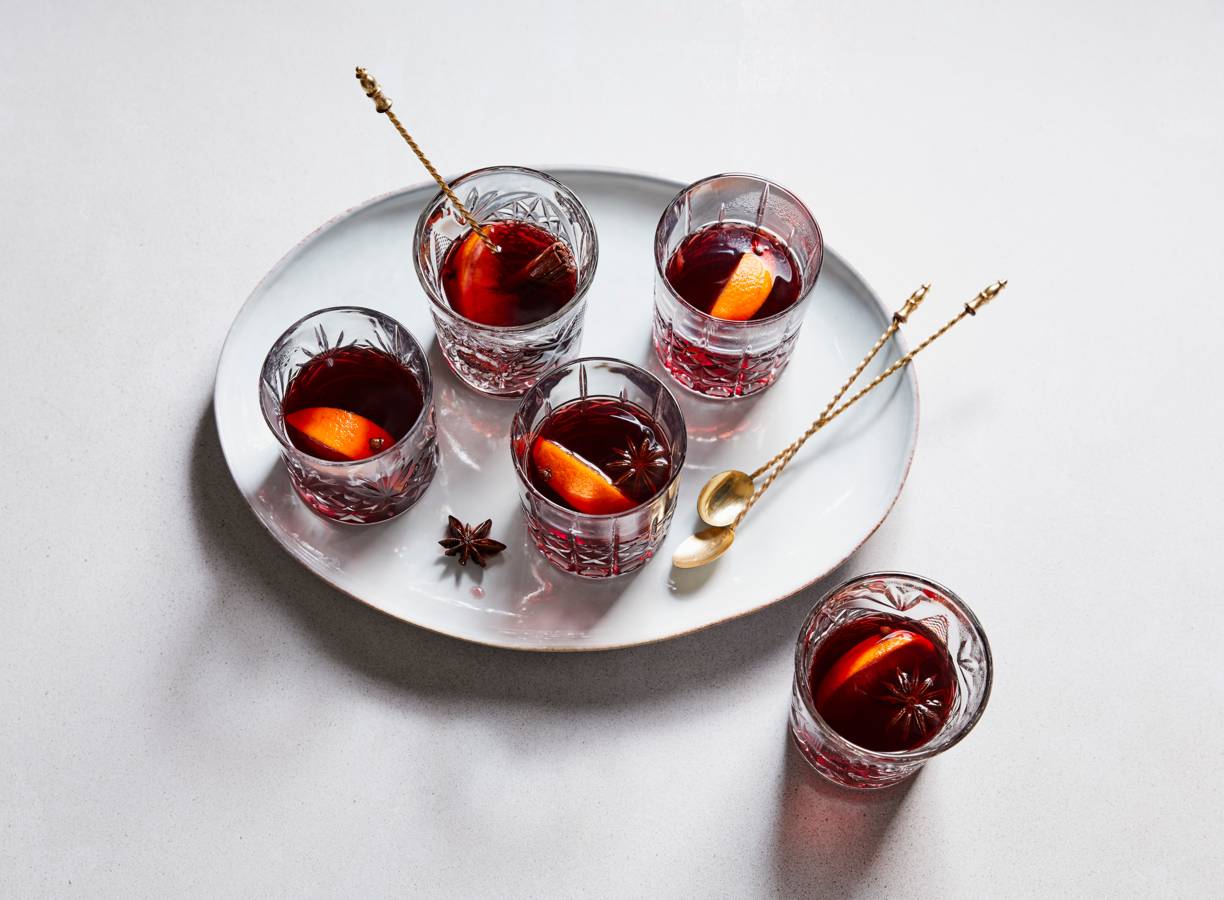 Steek de kruidnagels rondom in de sinaasappel en snijd de sinaasappel vervolgens in partjes. Schenk de rode wijn en gin in een steelpan en voeg de suiker, steranijs, kaneelstokjes en sinaasappelpartjes toe.