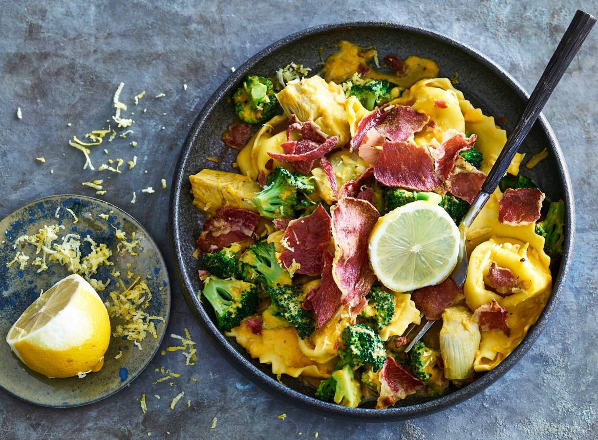 Snijd ondertussen de broccoli in kleine roosjes, schil de stronk en snijd in kleine stukjes. Maak de knoflook schoon en snijd fijn. Laat de artisjokharten goed uitlekken en snijd in parten. Boen de citroen schoon en rasp de gele schil. Halveer de citroen en snijd een helft in plakjes.