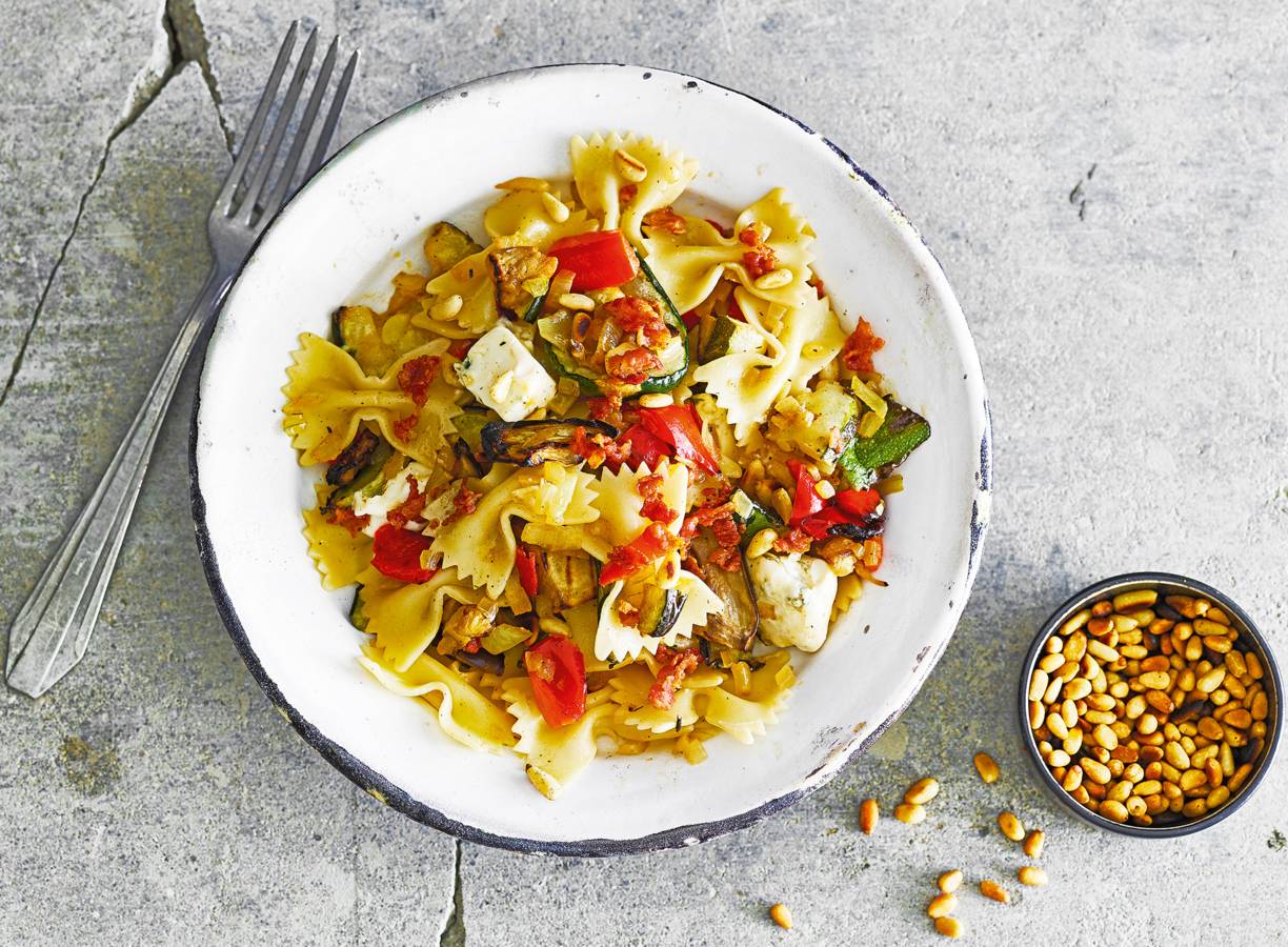 Pasta met gegrilde groenten, spek en gormas