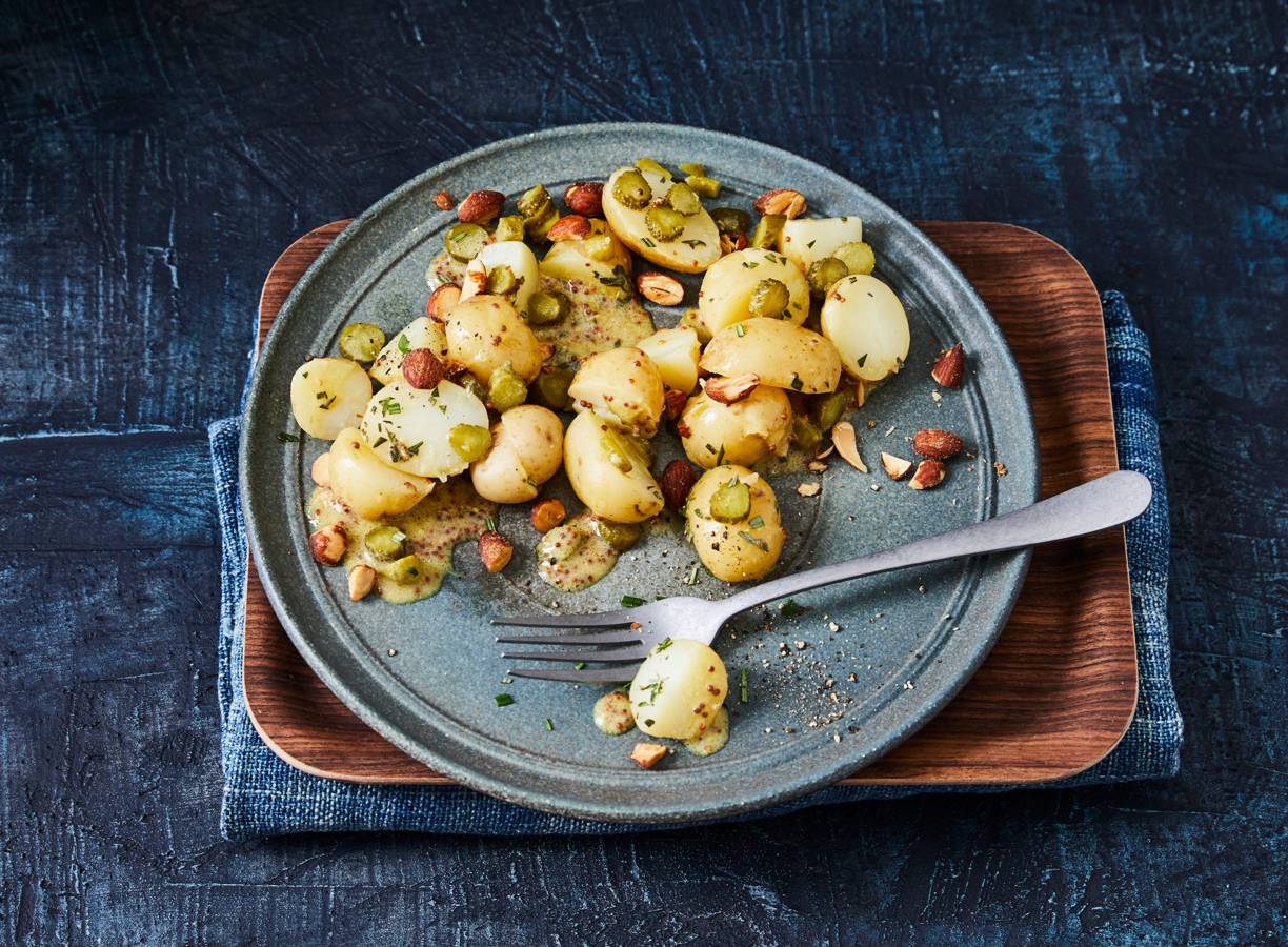 Aardappeltjes met rozemarijn is natuurlijk een klassieke combi, maar met mosterd, augurkjes en amandelen is het weer helemaal van nu.
