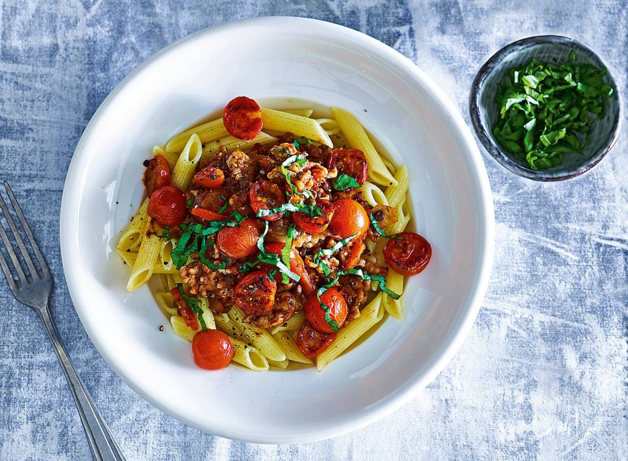 Halveer ondertussen de cherrytomaten. Verhit de rest van de olie in een grote koekenpan en bak de tomaten op de snijkant 2 min. op hoog vuur. Snijd de blaadjes basilicum in reepjes. Verdeel de penne over de diepe borden, verdeel de saus erover en schep de tomaatjes erop. Bestrooi met het basilicum.
