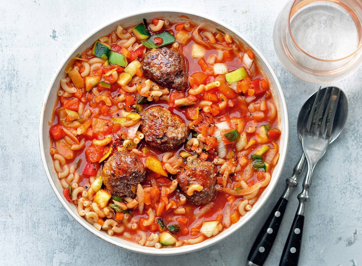 Snijd de korstjes van het brood. Doe de melk in een diep bord en week het brood erin. Meng het brood, de gehaktkruiden en het zout door het gehakt. Vorm er met vochtige handen balletjes van ter grootte van een walnoot. Breng het water aan de kook. Verhit ondertussen de olie in een hapjes- of braadpan en bak de balletjes op hoog vuur in 5 min. rondom bruin. Voeg de roerbakgroente, macaroni, passata en het kokende water toe. Breng aan de kook, roer goed door en laat zonder deksel op de pan in 15 min. gaar worden.