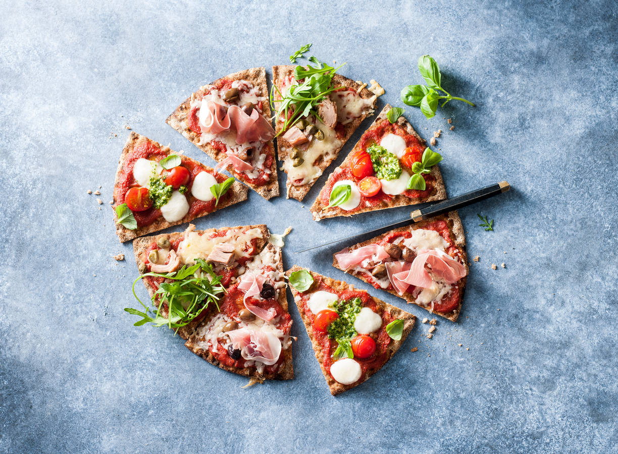 - variatietipMet vlees: verdeel behalve de pizzasaus ook 60 g geraspte Parmezaan en 100 g zongerijpte olive nere (potje 180 g) over de pizzapunten en bak ze in de oven. Snijd 75 g parmaham in repen en verdeel erover.