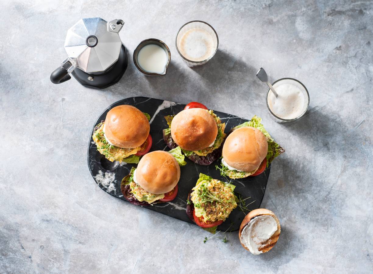 Haal ondertussen de blaadjes sla van de paarse krop romaine en halveer. Snijd de tomaten in plakjes. Besmeer de broodjes met de zuivelspread en leg op elke broodje wat sla, een burger, tomaat en tuinkers. Serveer direct.