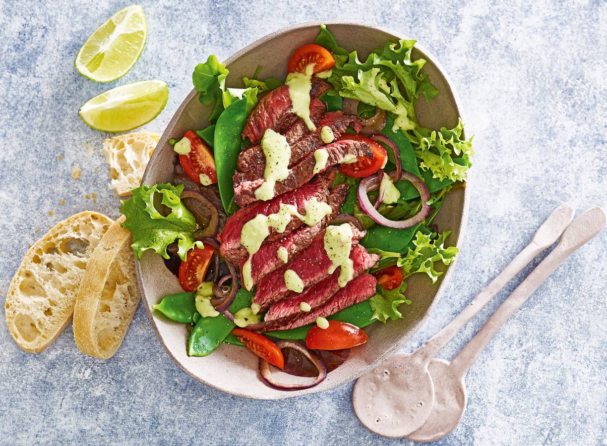 Verdeel de sla over een schaal en verdeel de avocado, rode ui, peultjes en tomaten erover. Snijd de biefstuk in dunne plakjes. Besprenkel met de dressing. Snijd de ciabattina's in plakken en serveer erbij.