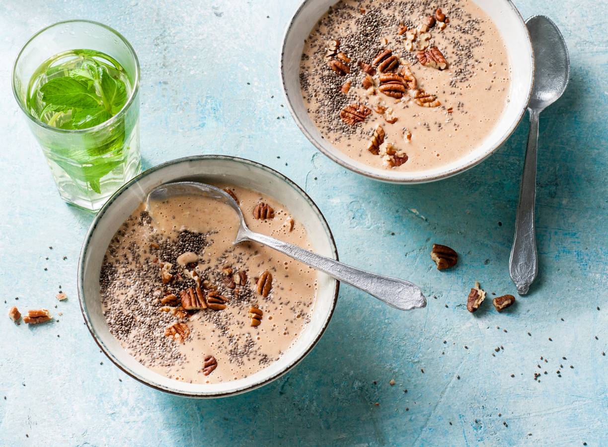 Meng pindakaas, banaan en havermelk in de blender. Hak de noten grof. Verdeel over de kommen en bestrooi met de noten en het chiazaad.