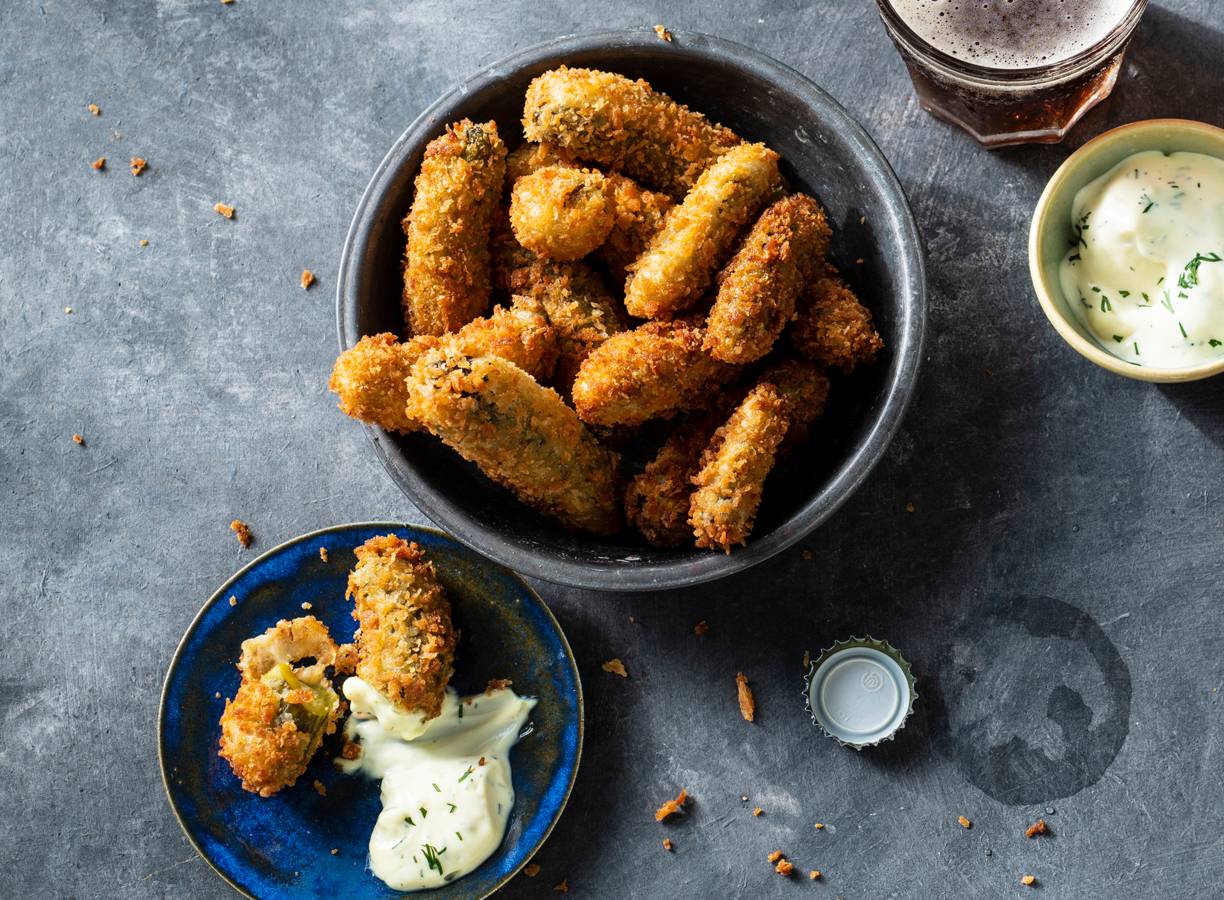 Maak ondertussen de dressing door de yoghurt, mayonaise en dille door elkaar te mengen. Serveer met de gefrituurde augurken.