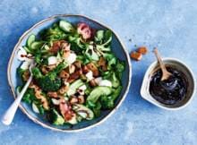 Meng de sla met de broccoli, komkommer, mozzarellabolletjes en kruidkoekcroutons. Verdeel over de kommen en breek de pancetta in stukken erover. Verdeel de stroopdressing erover.