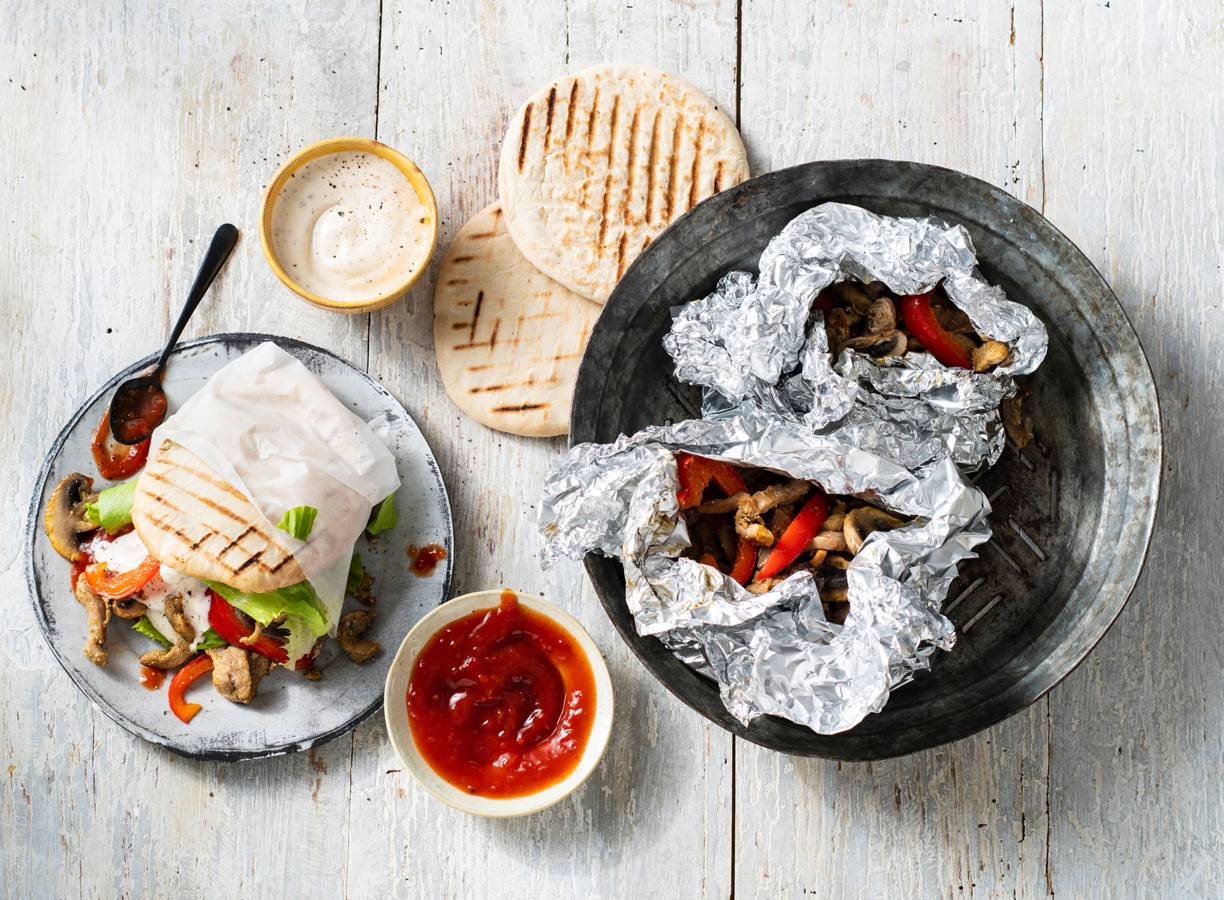 Scheur zoveel stukken aluminiumfolie van de rol als je nodig hebt en verdeel de champignons, ui, paprika en het shoarmavlees erover. Vouw de pakketjes dicht. Prik een gaatje in de onderkant van elk pakketje. Zo kan vrijgekomen vocht ontsnappen. Leg de pakketjes ca. 15 min. op de barbecue.