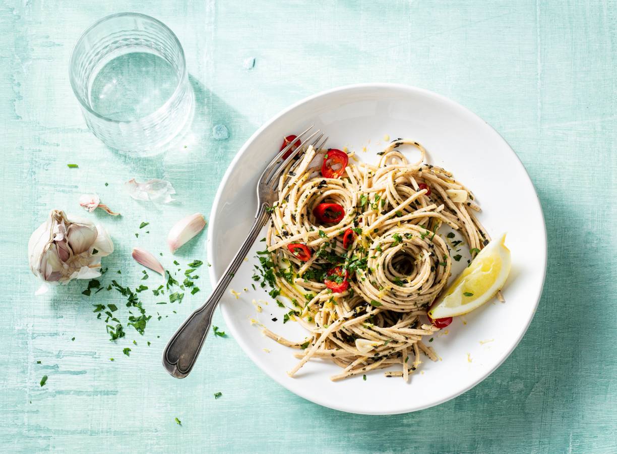Vegan pasta aglio olio met zeewier