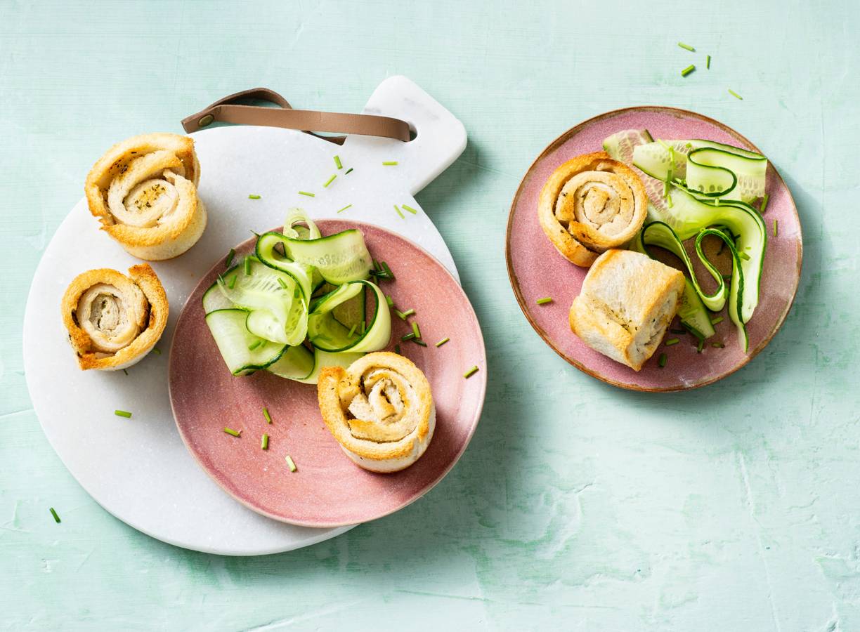 Leuk bij de borrel: rolletjes van casinobrood gevuld met kruidenboter.