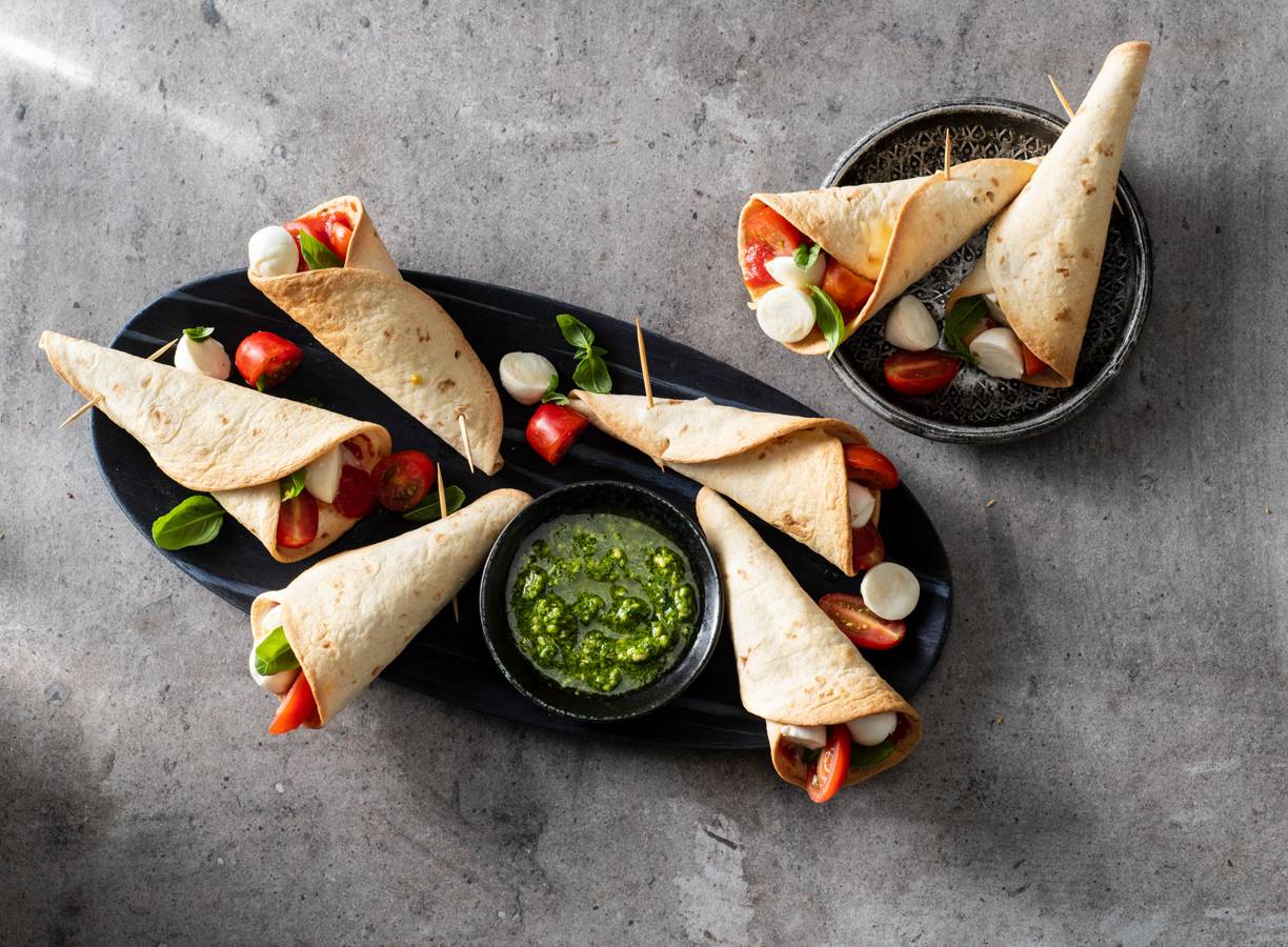 Halveer ondertussen de mozzarella en tomaten. Scheur het basilicum in stukjes. Meng door elkaar. Neem de cones uit de oven en vul ze met de salade. Verwijder de cocktailprikkers en serveer.
