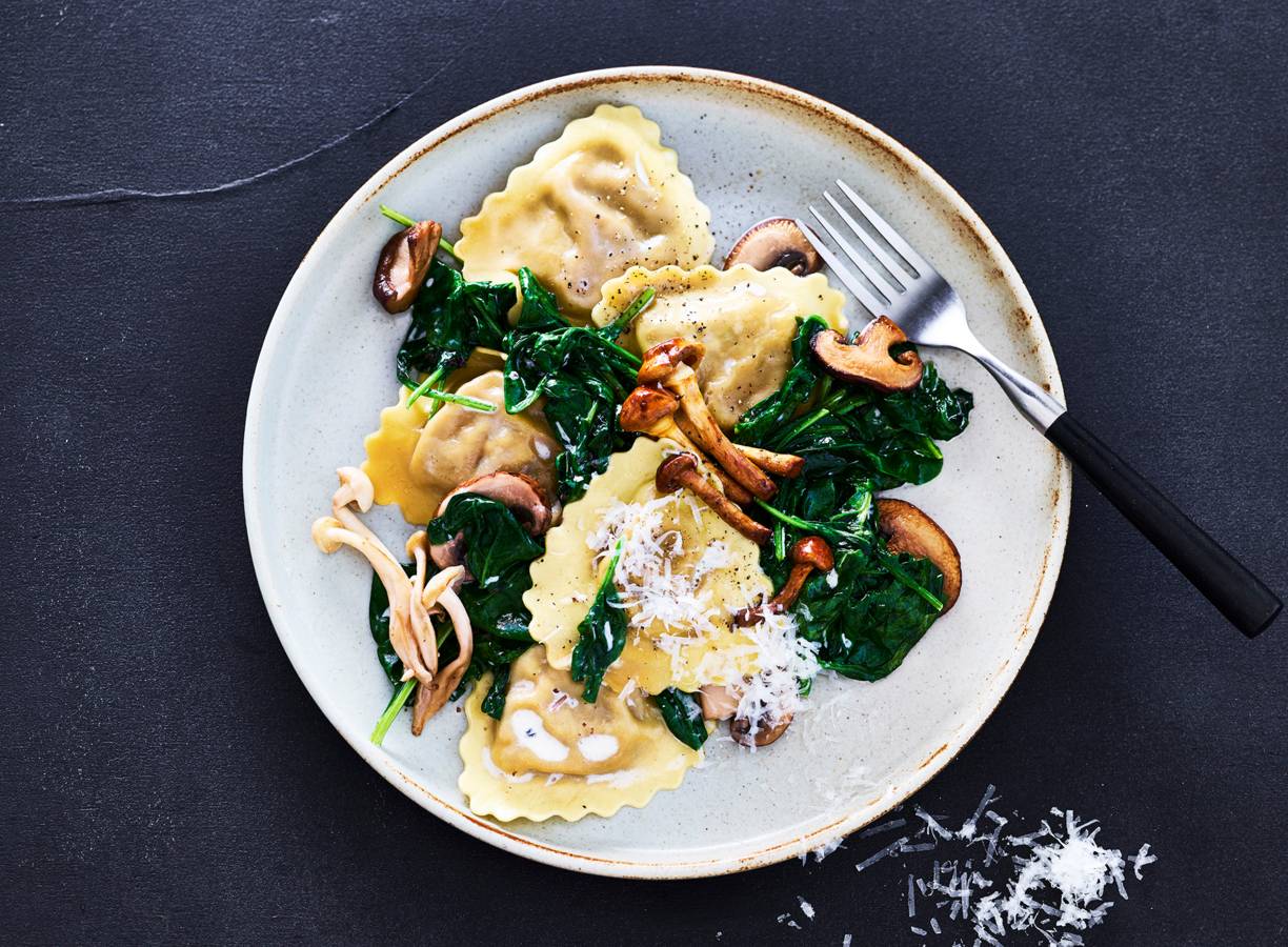 Mezzelune met paddenstoelenroomsaus en spinazie