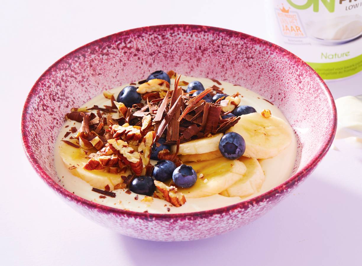Verdeel de plantaardige kwark over de kommen en verdeel daar de plakjes banaan, bessen, noten en chocolade over.
