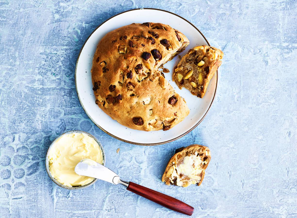 Vorm een bal van het deeg en leg op een met bakpapier beklede bakplaat. Strijk het deeg met natgemaakte handen glad. Bak de kwarkbol in ca. 1 uur bruin en gaar in het midden van de oven. Dek af met aluminiumfolie als het brood te donker wordt. Laat in 2 uur akoelen.