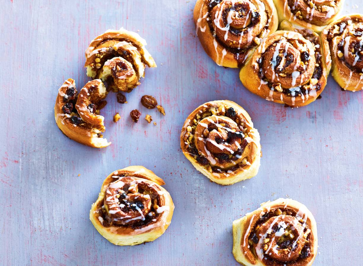 Opgerolde kaneel-walnoten-rozijnenbroodjes