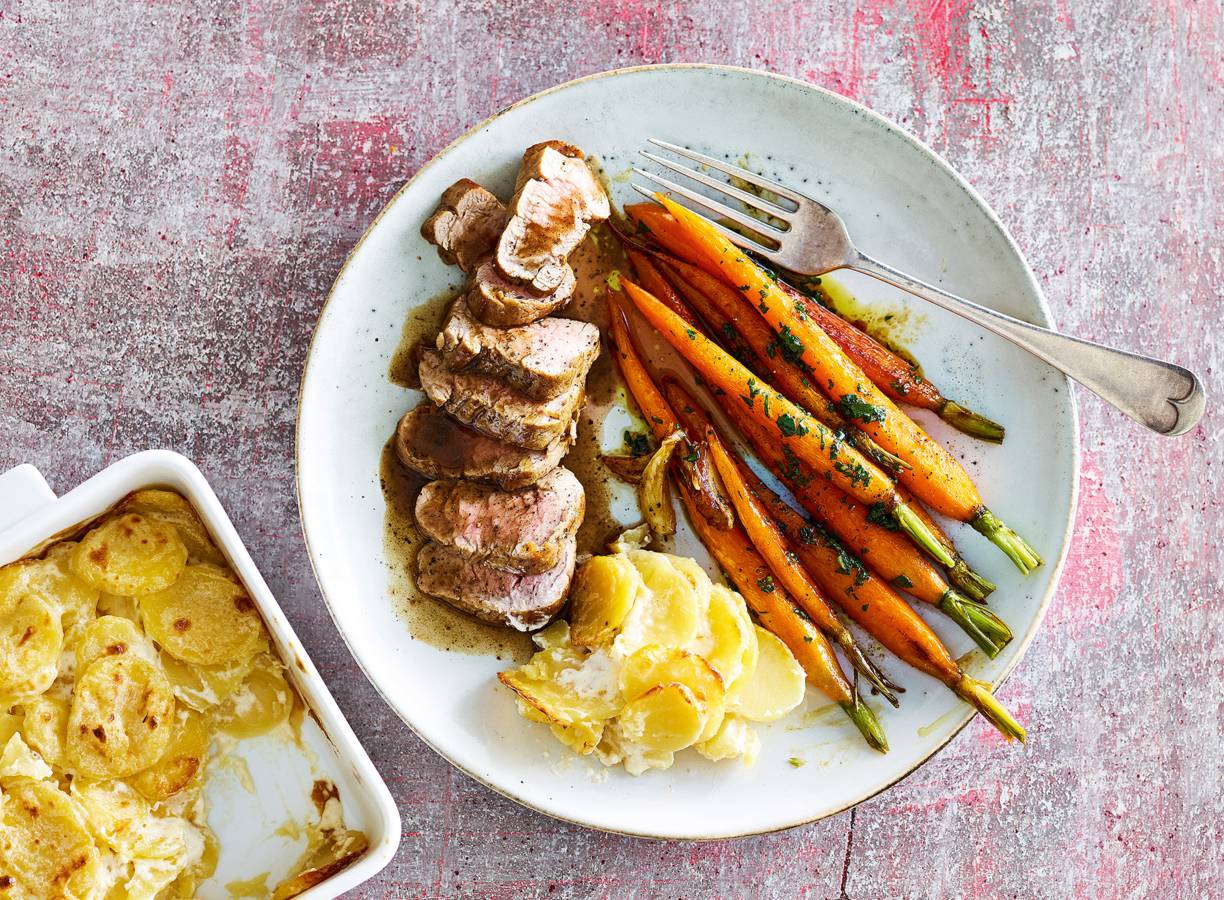 Varkenshaas met gekaramelliseerde wortels en aardappelgratin