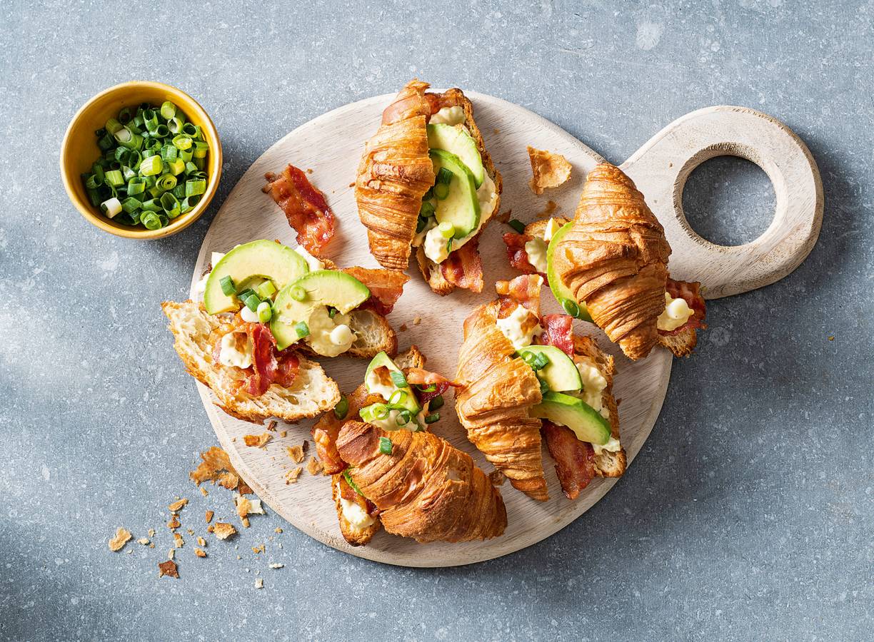 Alle ingrediënten die bij een brunch niet mogen ontbreken: croissants, spek, ei en avocado.