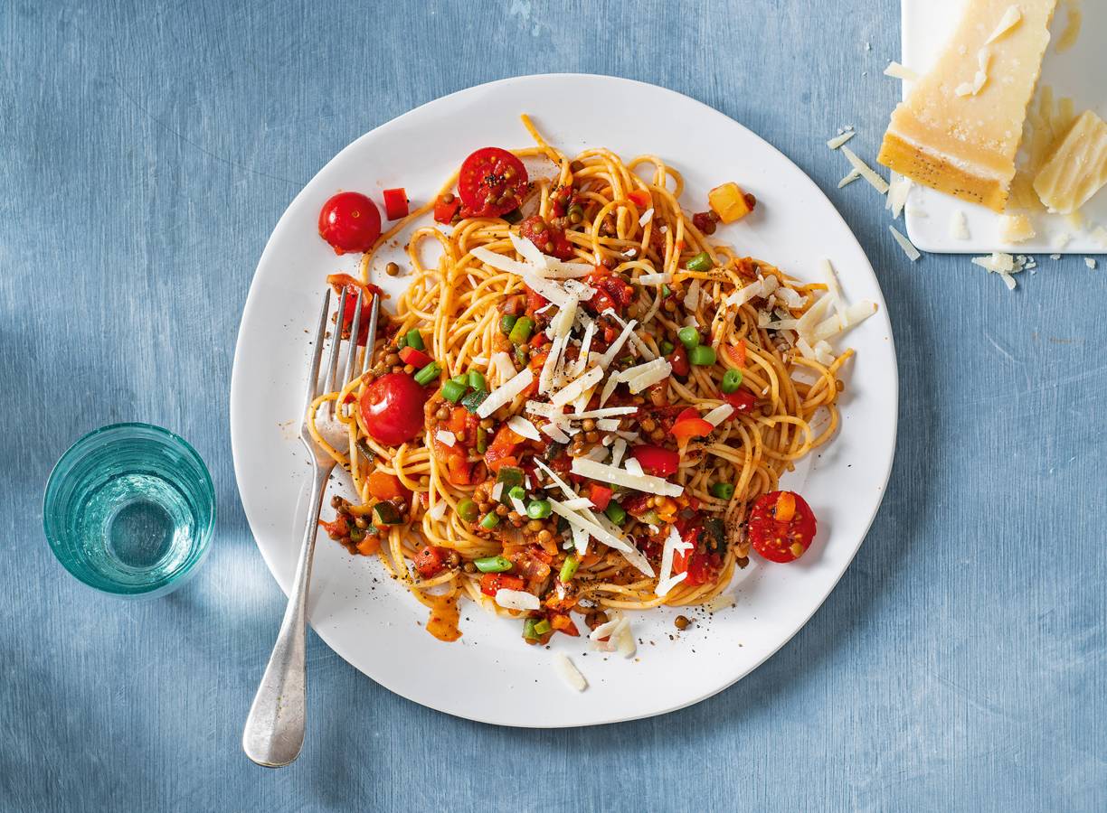Spaghetti met linzen-tomatensaus & Parmezaanse kaas