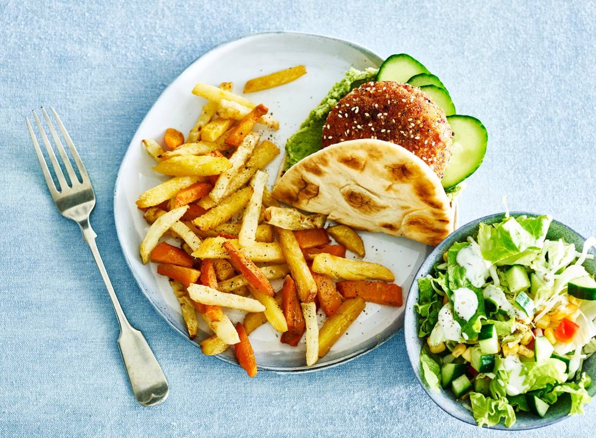 Vegetarische Mexicaanse chiliburger met groentefriet & salade