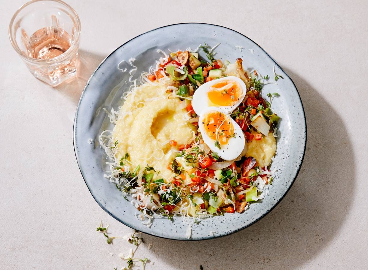 Verdeel de polenta over diepe borden en leg de groente en eieren erop. Bestrooi met de tuinkers en breng op smaak met peper en eventueel zout.