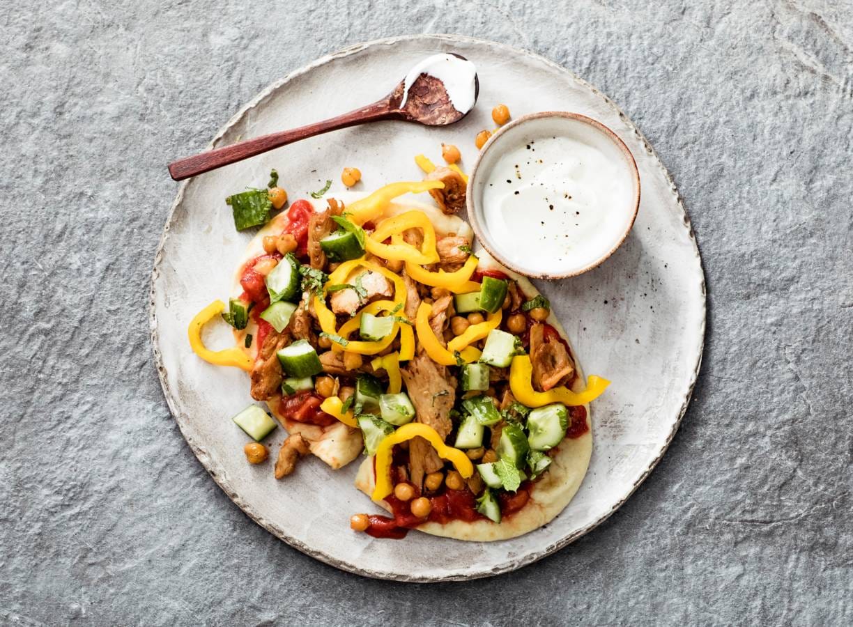 Vegashoarma met komkommersalade & flatbreads