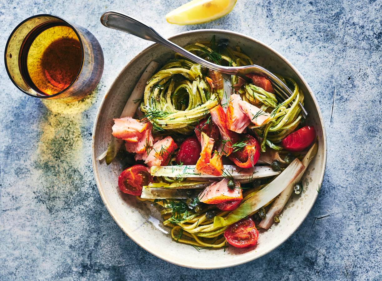 Romige tagliolini met gerookte zalm, witlof & cherrytomaatjes