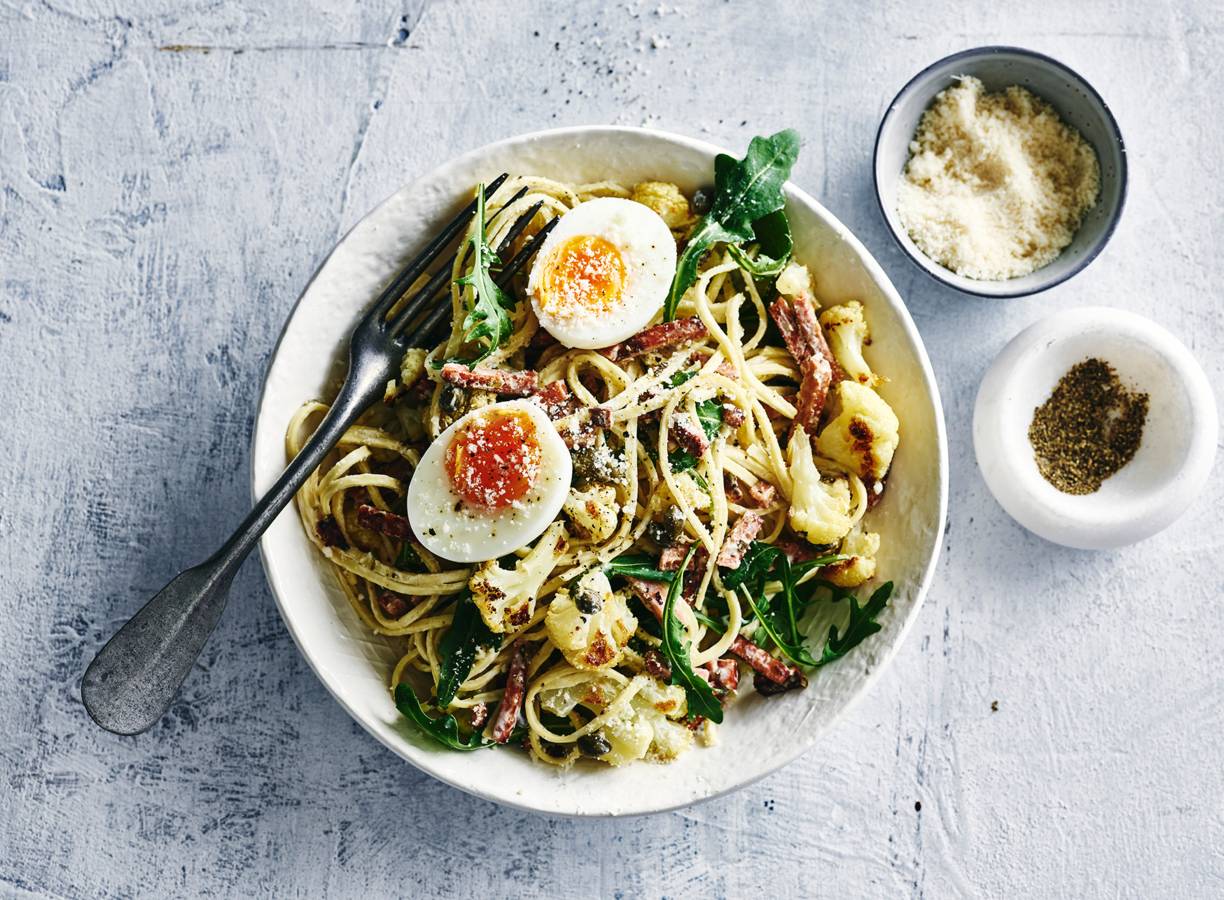 Spaghetti met ei, vega spekreepjes & geroosterde bloemkool