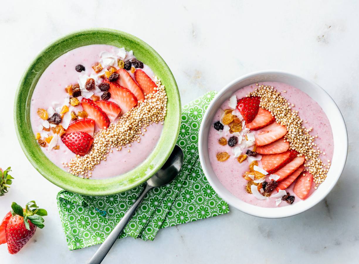 Het recept voor een goed humeur? Deze smoothiebowl met aardbeien ziet er zo vrolijk uit dat jij je dag goed begint.