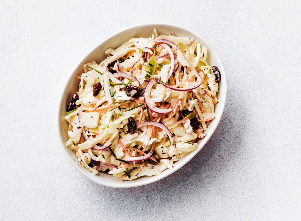 Meng de yoghurtmayonaise met de azijn tot een glad mengsel. Snijd de bieslook fijn en meng door de dressing. Plet het karwijzaad met de bolle kant van een lepel of in een vijzel en roer door de door dressing. Schep de witte kool en de rozijnen door de dressing. Breng de salade op smaak met peper en eventueel zout. Zet minstens 1 uur afgedekt in de koelkast.