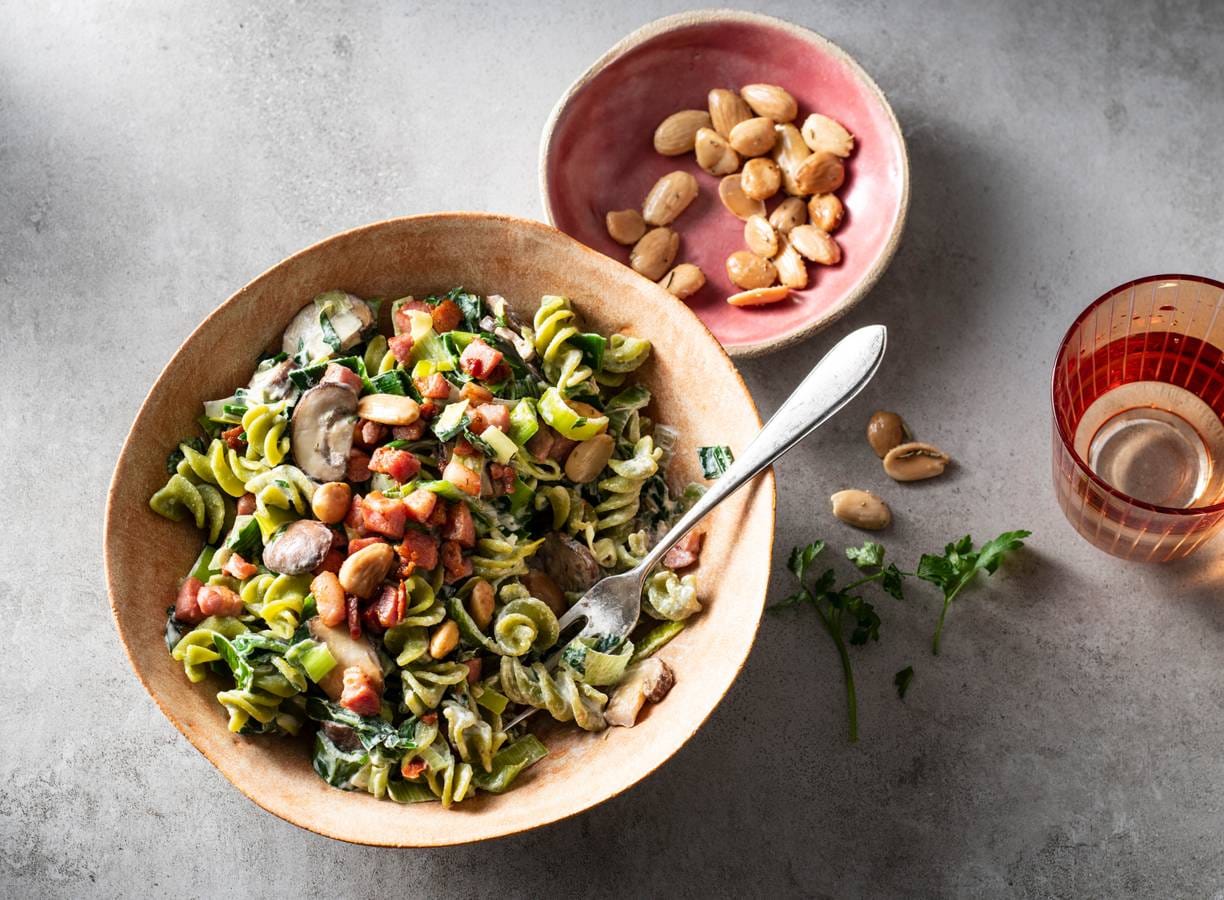 Fusilli van doperwten met spekjes & champignonroomsaus
