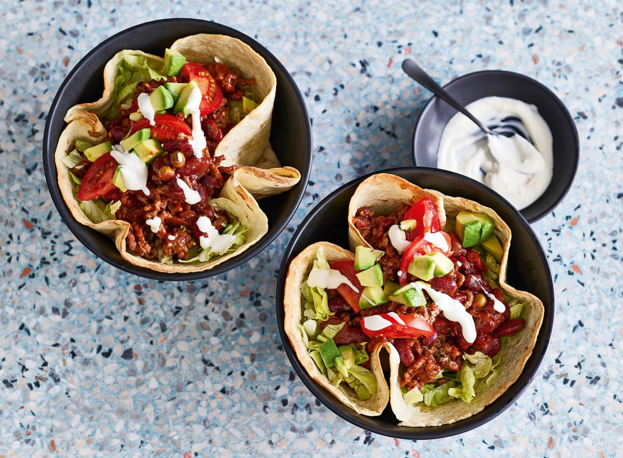 Verdeel de ijsbergsla over de tacobowls. Verdeel de gehaktbonenschotel erover. Garneer met de tomatenpartjes en de avocadoblokjes.