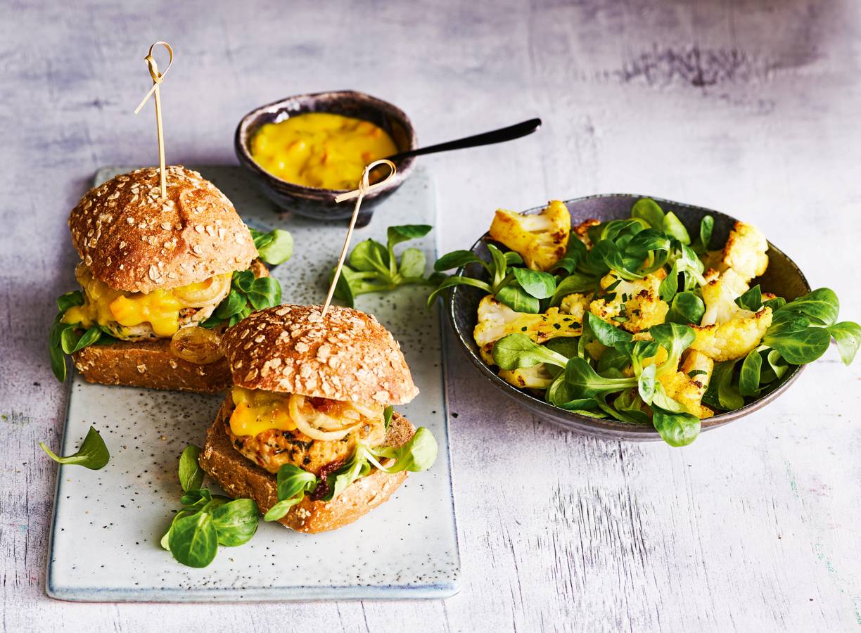 Snijd de broodjes doormidden en beleg ze achtereenvolgens met een beetje veldsla, een kipburger, piccalilly en de gekaramelliseerde uien. Schep de bloemkoolroosjes om met de rest van de peterselie en de rest van de veldsla. Serveer de salade bij de burgers.