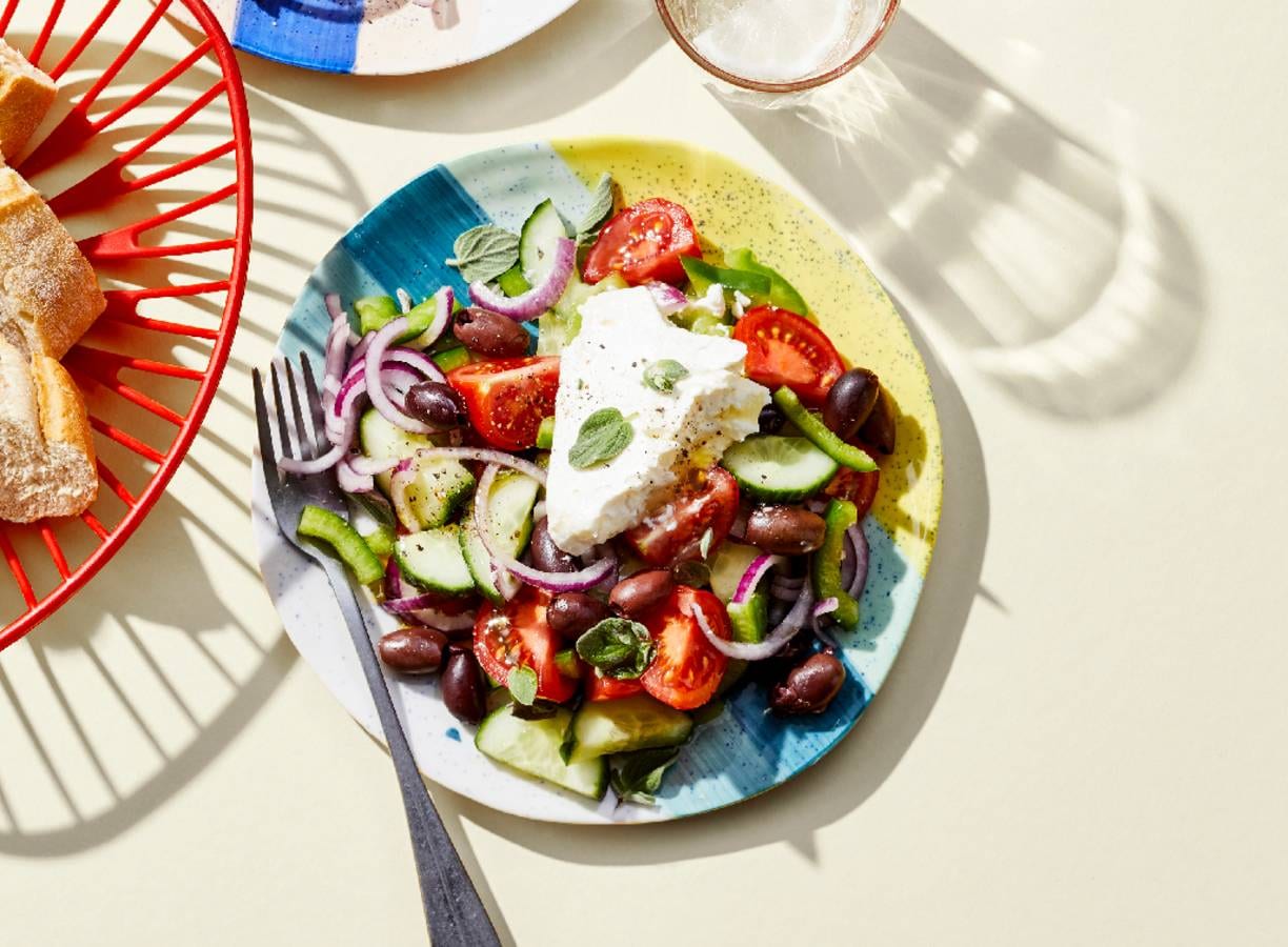 Griekse klassieker: salade met feta, kalamata olijven, paprika, ui en tomaat.
