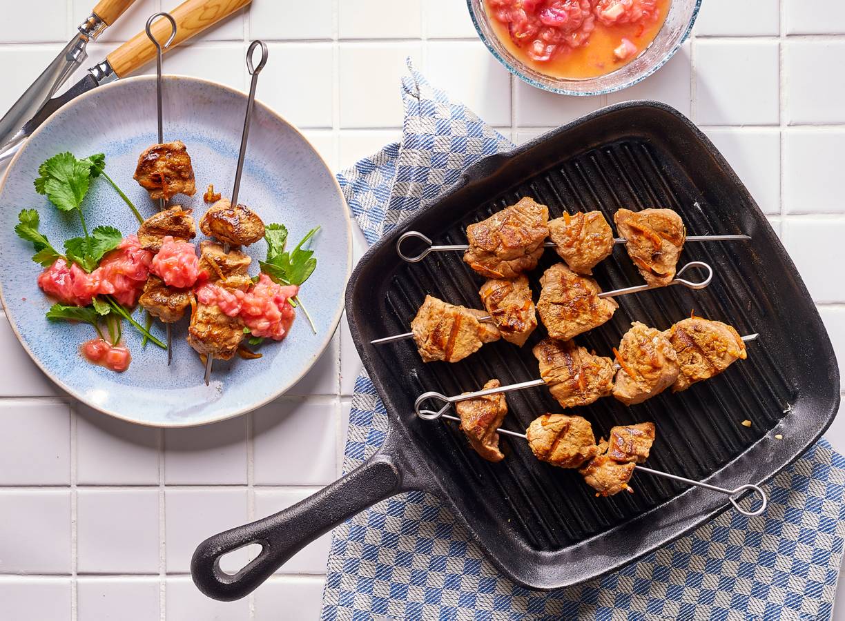 Rijg de stukjes varkenshaas aan de satéprikkers. Verhit de grillpan zonder olie of boter op hoog vuur en gril de spiesjes 6 min. Keer halverwege. Serveer de spiesjes op een bord en besprenkel met de helft van de rabarbersalsa. Serveer de rest van de salsa erbij.