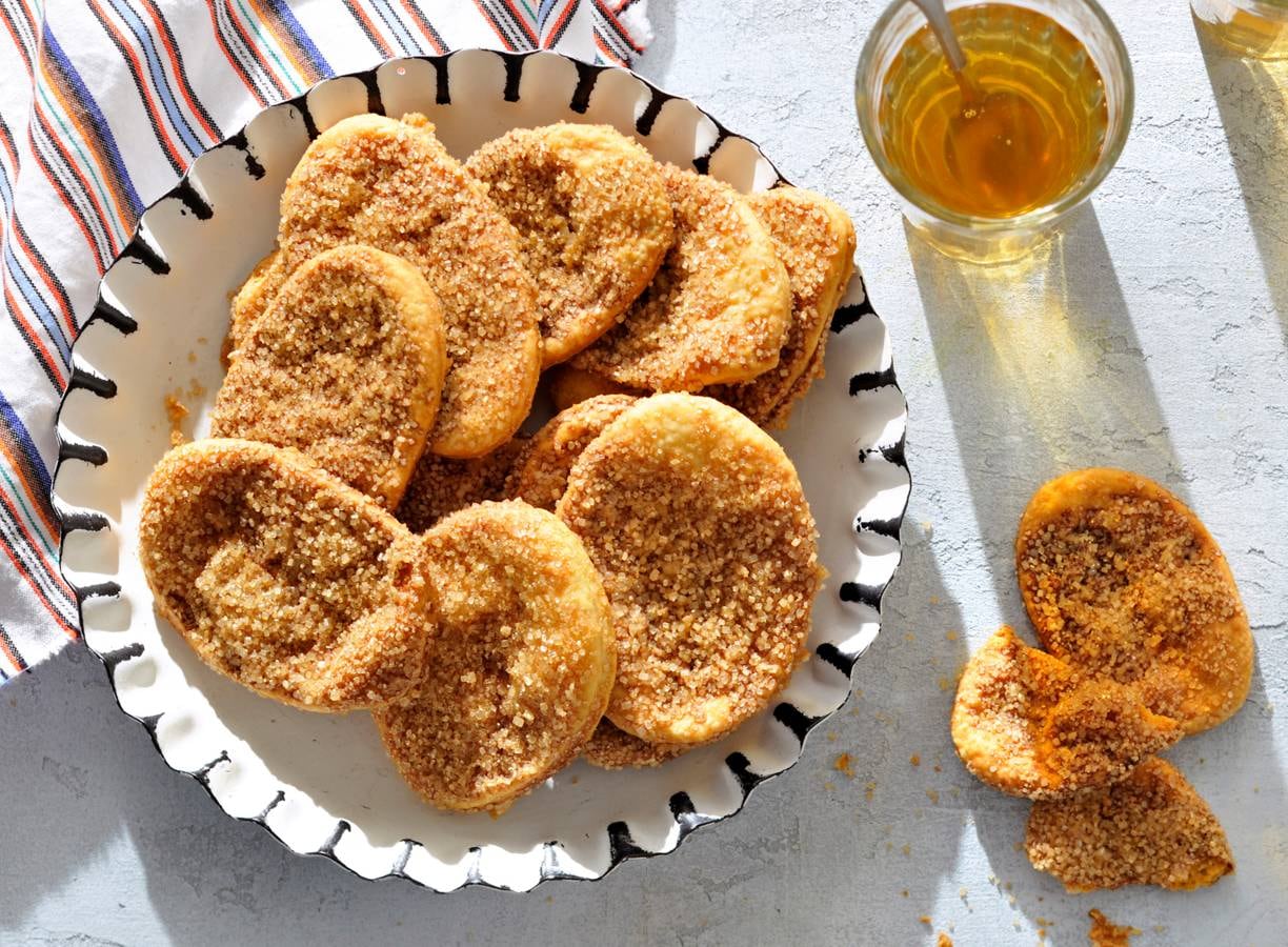 4. Bestrooi het werkblad dik met ¾ van de suiker. Leg de koekjes op de suiker. Strooi de rest van de suiker er gelijkmatig overheen. Rol met de deegroller over de koekjes, zodat de suiker erin drukt en ze 2 mm dik zijn. Leg ze op 2 met bakpapier beklede bakplaten.