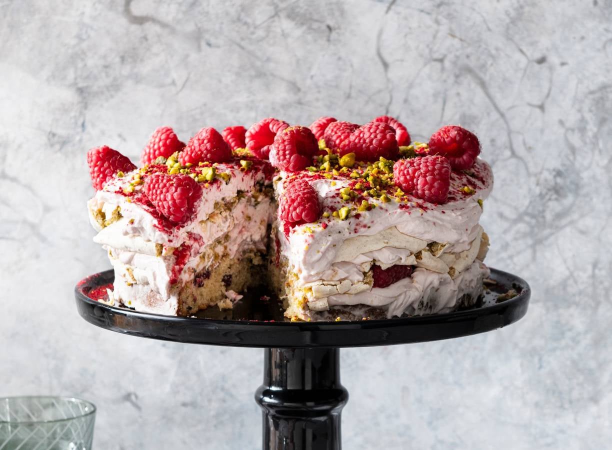- bereidingstipBouw de taart maximaal 30 min. voor het serveren op. De cake en de meringuelagen kun je tot twee dagen van tevoren maken. Bewaar de cake en meringue apart van elkaar, goed verpakt in aluminiumfolie en buiten de koelkast. De vulling kun je de ochtend zelf maken, roer de frambozen er pas kort van tevoren door. Hoe langer je het laat staan en hoe meer je roert, hoe rozer de vulling wordt.