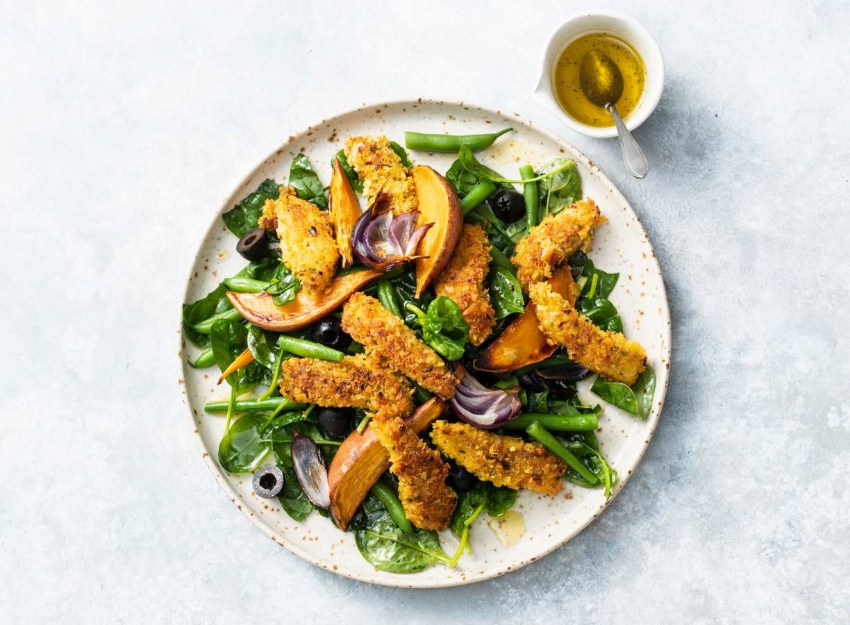 Kipdijfilet met zoete aardappel-spinaziesalade