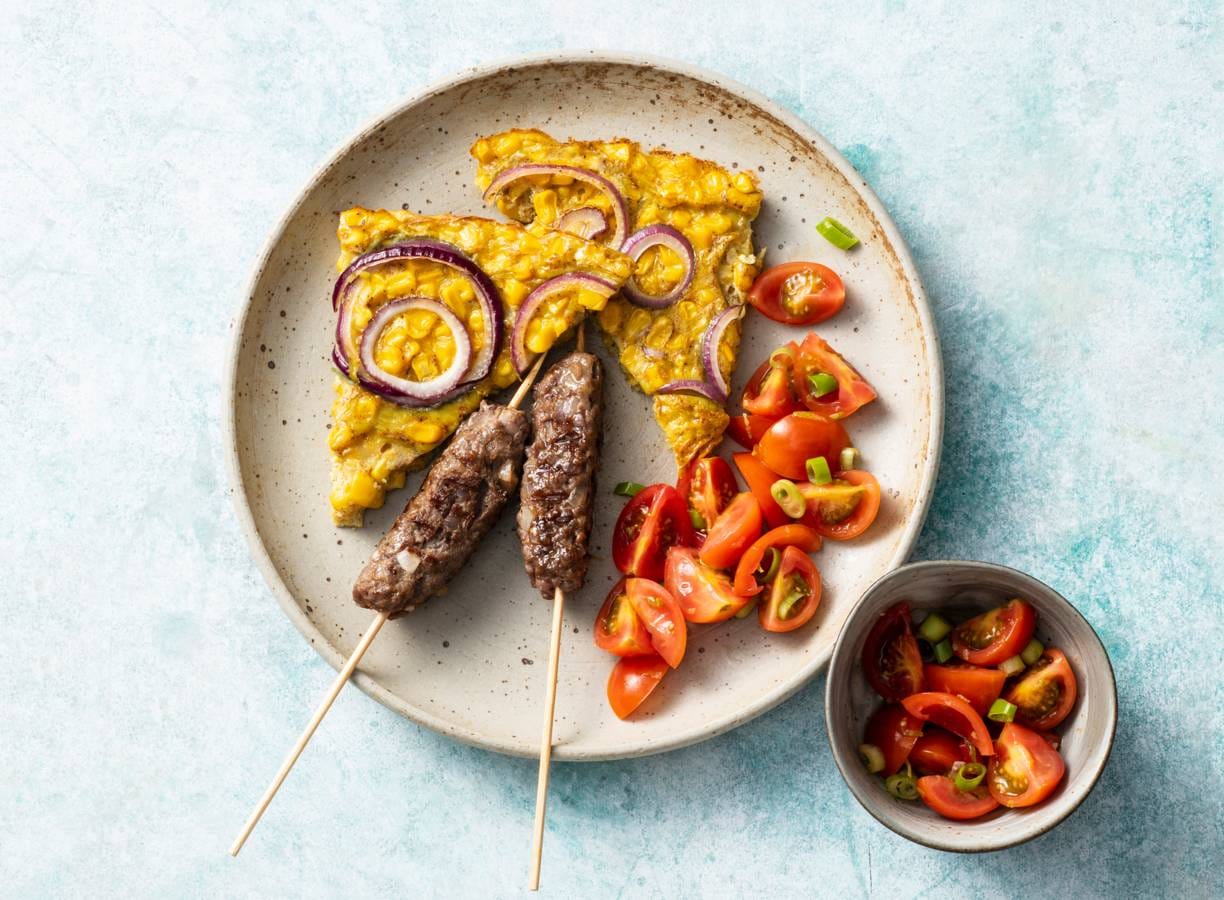 De frittata staat in no time in de oven. Daarbij eet je zelfgemaakte kruidige gehaktspiesjes en salsa.