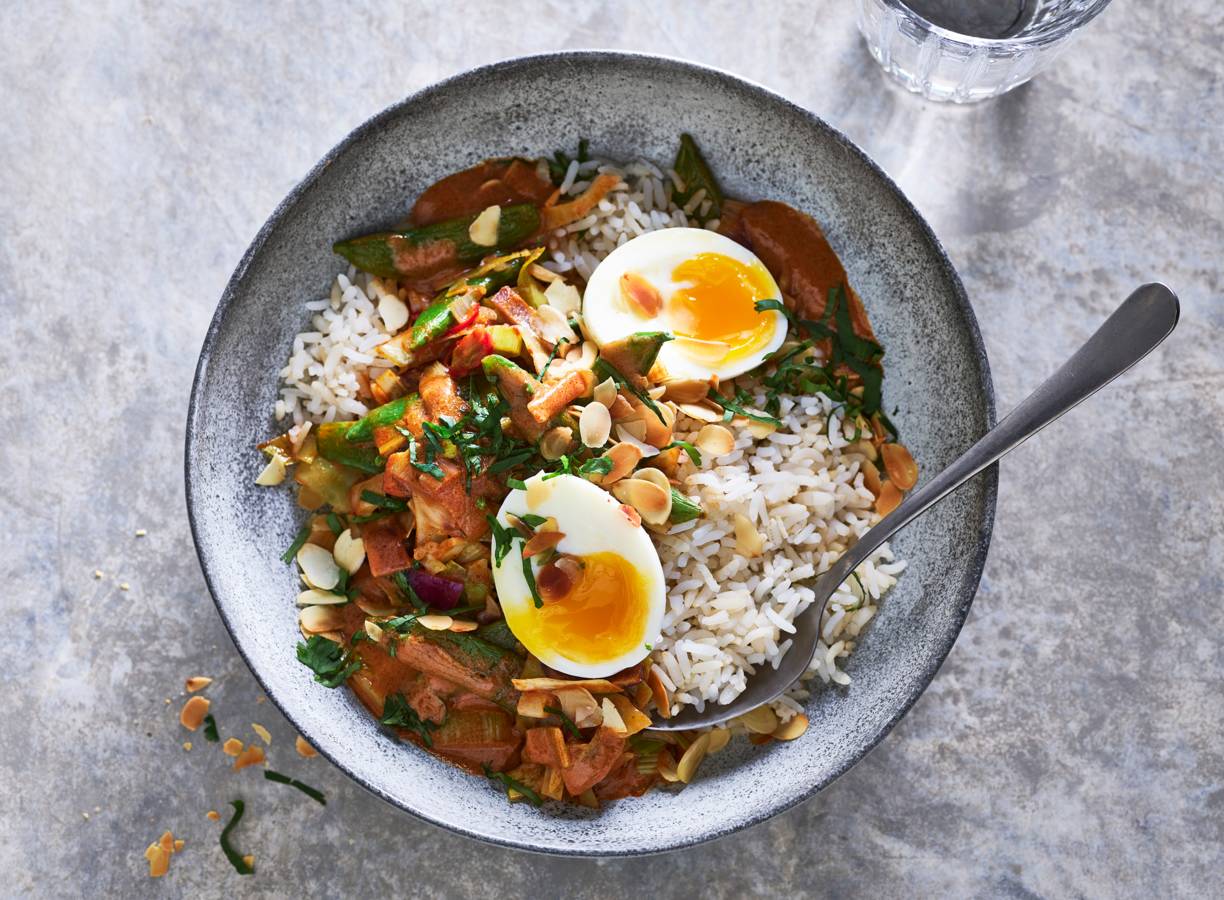 Pittige curry met halfvolkorenrijst& zachtgekookt ei