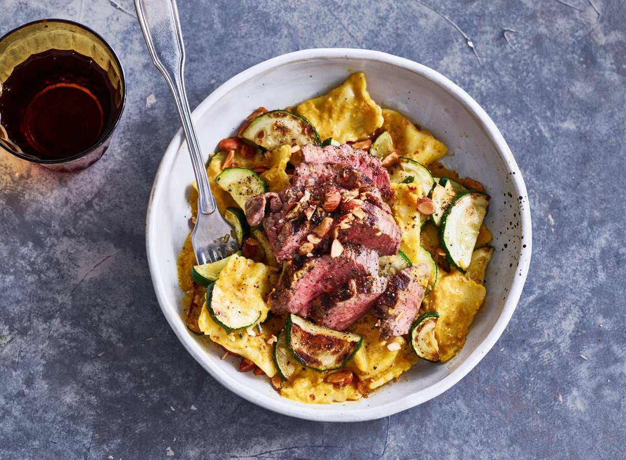 Kook ondertussen de ravioli in 6 min. gaar. Giet de pasta af, maar vang een kopje kookvocht op. Doe terug in de pan en meng de pasta met de romescosaus. Voeg eventueel wat kookvocht toe om het wat smeuïger te maken. Verdeel de ravioli en courgette over de borden. Snijd de biefstuk in reepjes en leg erop. Hak de rest van de amandelen grof en strooi over de pasta.