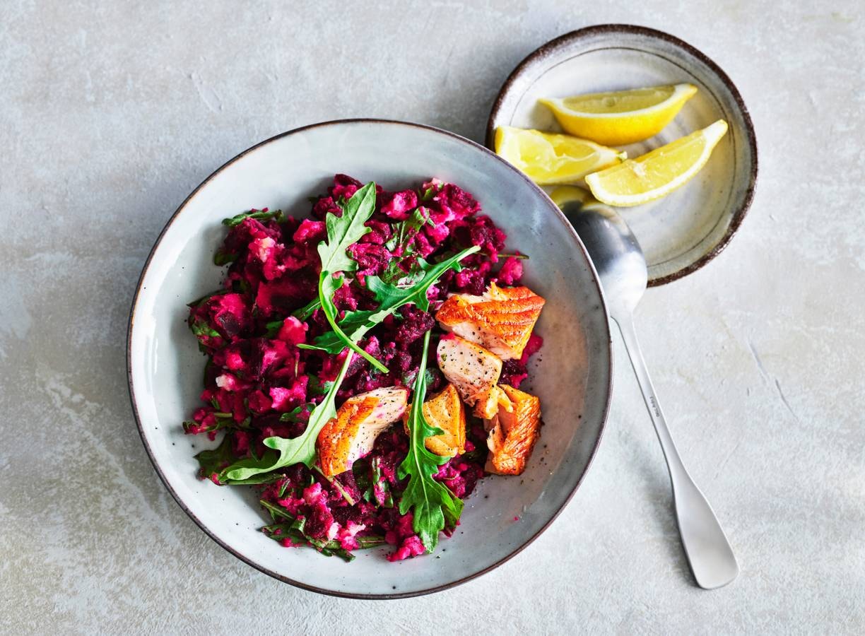 Rode-bietenstamppot met warmgerookte zalm